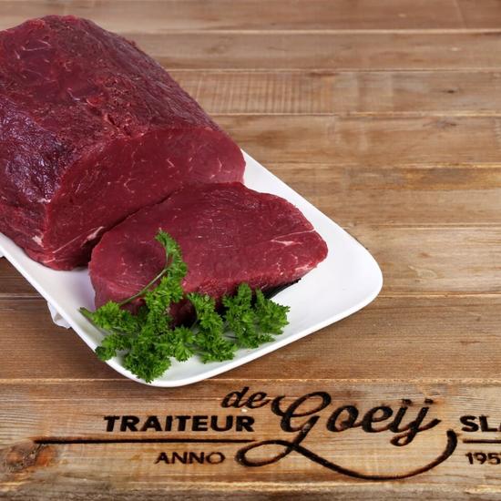 Haasbiefstuk bakken Haal de biefstukjes altijd een uur van te voren uit de koelkast, zo kan de kern alvast op kamertemperatuur komen. Haas is het malste en mooiste deel van het rund. Biefstuk van de haas wordt ook wel tournedos (150 gram) of Chateaubriand (250 gram) genoemd. Een ossenhaas weegt ongeveer tussen de twee en vijf kilo. Zout voor of na het bakken? Meestal wordt aangeraden om zout pas na het bakken op de biefstuk te strooien. Nadeel hiervan is dat het zout niet kan intrekken in je vlees. Hierdoor krijg je een erg zoute buitenkant. Voor een betere smaak kun je zout dus het beste voor het bakken op de biefstuk strooien. Zout onttrekt vocht, dat is zeker waar, maar dan moet het daarvoor wel de kans krijgen. Bestrooi het zout dus ca. 1 minuut voor het bakken en daarna de peper. Doe je eerst peper dan zul je zien dan het zout op de peper blijft liggen en weinig kans krijgt in te trekken. Echt vochtverlies door het zout krijg je pas als je het ruim van te voren op het vlees strooit. Dat is dus niet aan te raden. Goed verhitten De perfecte biefstuk bak je vooral door de pan goed te verhitten. Het beste is om een pan met een dikke bodem te nemen. Verhit 3/4 van de boter in de pan op hoog vuur. Als het schuim weg is, is de boter goed op temperatuur. Leg de biefstuk vervolgens in de pan en voeg hierna de rest van de boter toe. Bakken ± 3-5 min. (Bij normale dikte) Kruiden Zout Peper Smaaksuggesties Biefstuk heeft van zichzelf smaak genoeg. Voedingswaarde per 100 gram Energie: 116 kcal. Eiwit: 23.7 gram Vet: 2.3 gram IJzer: 2 milligram